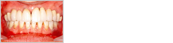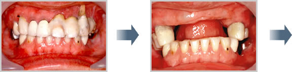 骨が飛び出した部分の骨と歯肉をつくり、インプラントを6本入れて完全に審美性の回復を行うことで、完璧な治療となる。