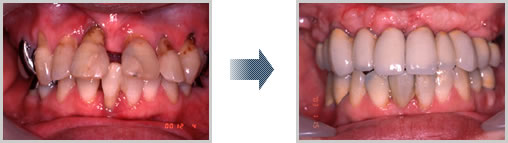 主訴:すべての歯が動きだしてかめない。 インプラントと、歯周外科を行い、回復した。