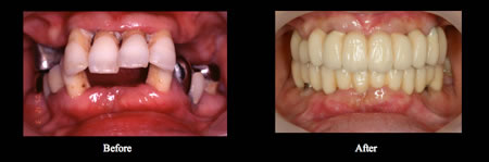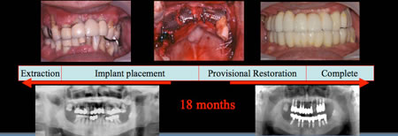 以前はこのタイプの治療が中心でした。歯周病におかされた60歳代男性の口腔内の状況です。この患者に抜歯を行い、チタンプレートを装着し自家骨移植を行い大きな治療、また可能な限り多くのImplantを埋入する治療の方法がとられました。骨の高さ、幅、審美性は確かに回復されたかもしれませんが、長期治療期間18ヶ月を要しました。何本のインプラントを使用したのでしょうか?16本のインプラントを使用しました。