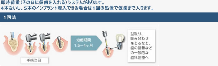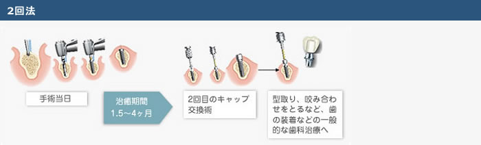 インプラント治療には、1回法と2回法と呼ばれる方法がこれまで行われてきています。インプラント治療の基本的な方法です。