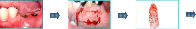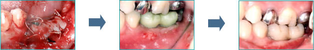 骨の量・質が十分でない場合、インプラントを入れることができません。骨をつくるために、メンブレンという膜を利用して骨を再生し、その幅高さを増した部分にインプラントを埋入します。強度が増し、インプラントに自然感を与えます。また、歯ぐきの凹凸感を与える為に、歯肉の移植(結合組織移植)を行うことがあります。